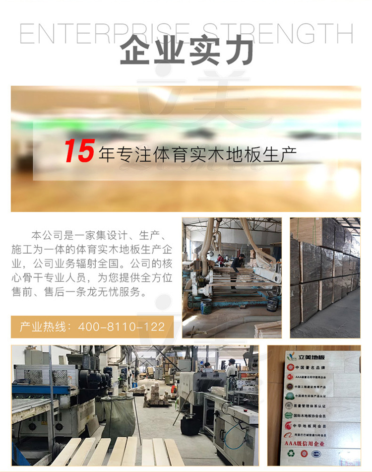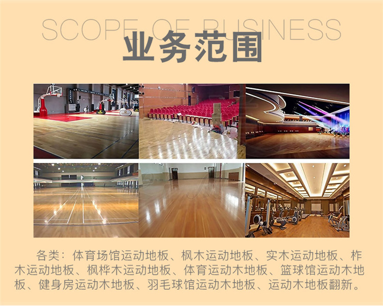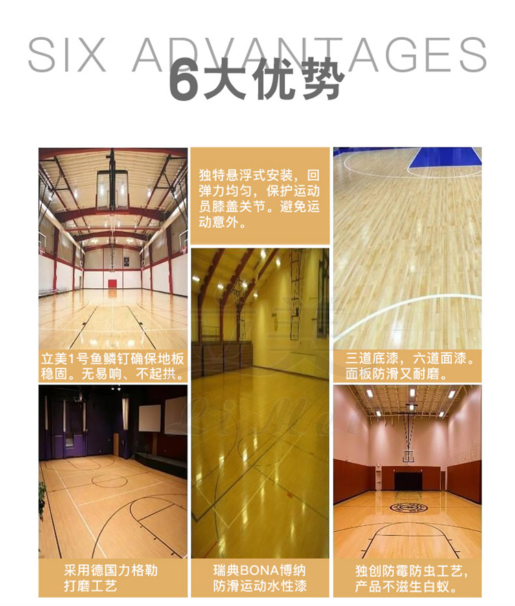 3、体育木地板的承重负荷牢固,使用寿命达到比赛及训练的要求,如活动篮球架及相关体育设施在体育木地板上移动时,它的表层和结构不会因为这些东西的移动而遭到破坏。